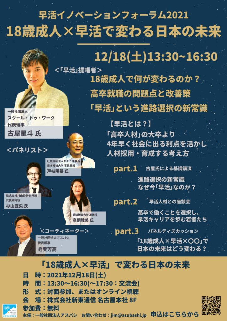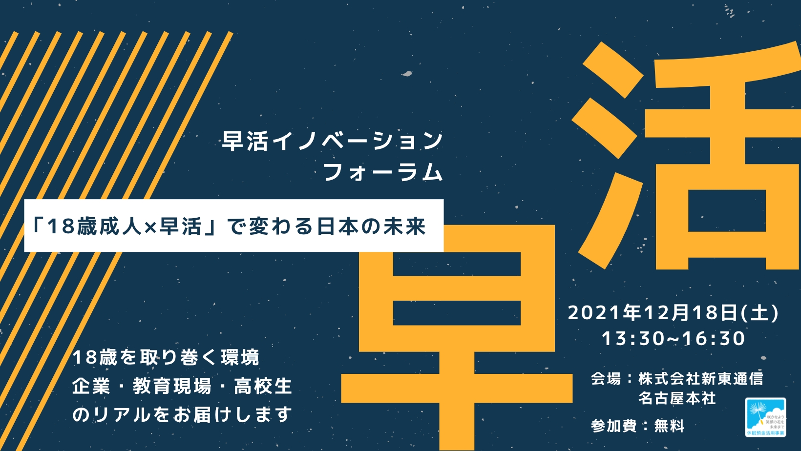 今回のイベントでは「早活」提唱者である古屋星斗氏をゲストに迎え、これからの時代の新常識をお伝えしていただきます。また、「早活」を推進する企業・学校・NPOが集い、進路選択の現状を変えるための方法を徹底議論します!