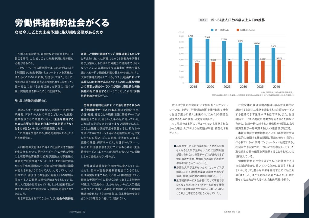 この状態を、古屋さんが進めていた「未来予測2040」という調査レポートでは「労働供給制約」と名づけています。その要因のひとつが、少子高齢化。2040年代前半には10人に1人が85歳以上になる。それは、労働の担い手、つまりは社会の維持に必要な人手の母数の減少を意味します。