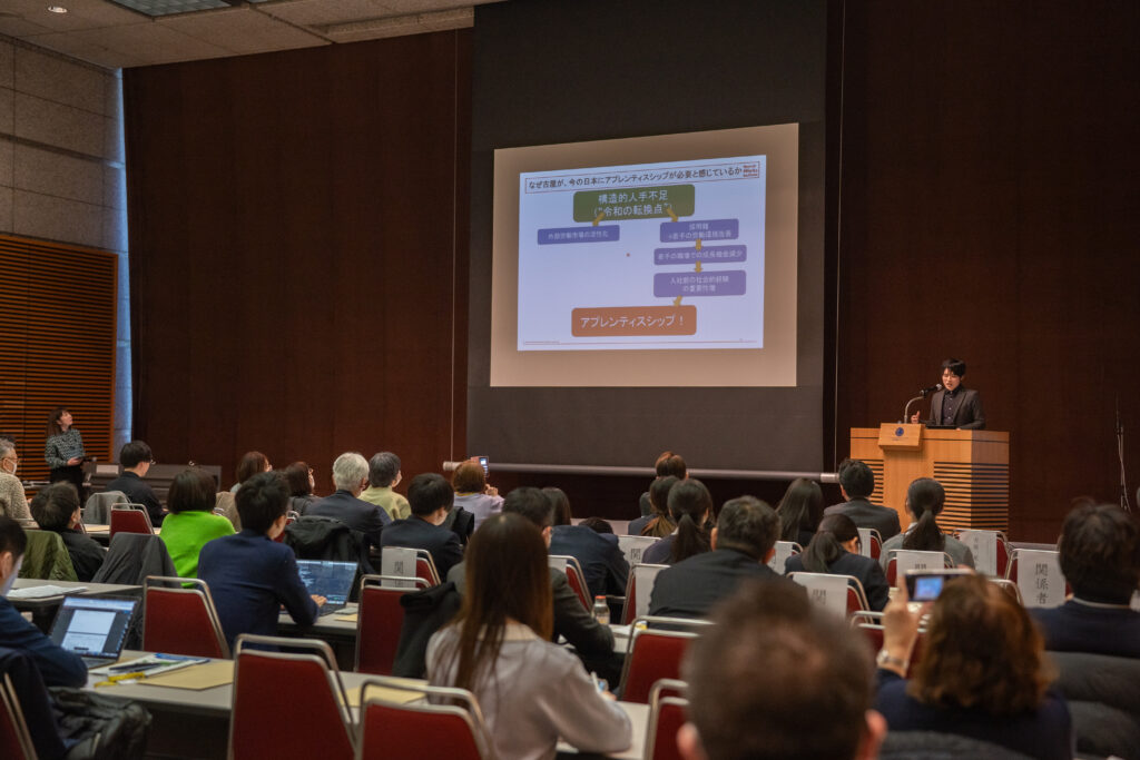 「働きながら学ぶ」という選択、アプレンティスシップ。日本での実例は少ないものの、いまの日本でこそ必要とされているのでは、と日本版アプレンティスシップの可能性を考えるべく、有識者の講演や実証事業の紹介、ワークショップなどが行われました。