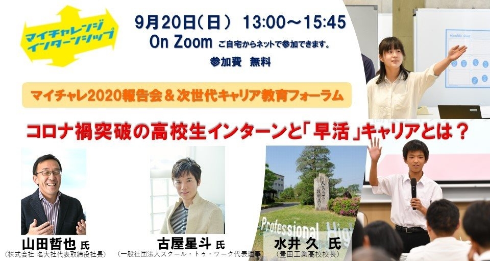 こうした機会にチャレンジした高校生たちのチカラは、先の見えない変化の激しい社会のなか、新しい時代にどうつながり活かされていくのでしょうか?そのひとつ新たなキーワードとして「早活」を取り上げます。「高卒就職」を、高校時代から早く社会にふれて活動し、卒業後に仕事に就き早く活躍するキャリアとしてとらえ、アップデートしていく「早活」を提唱する一般社団法人スクール・トゥー・ワークの古屋氏から講演と、フォーラムでは古屋氏に加え、「ジモト就職」を応援する名大社社長の山田氏、来年から工科高校と名称変更する豊田工業高校校長の水井氏の3名に、次世代のキャリア教育のあり方と、この変化の激しい社会の中で、若者の成長をどう加速していくか、について話し合います。コロナをきっかけに時代は変わった。時代の変化に合わせ、あなたの街、学校のキャリア教育をアップデートしませんか?